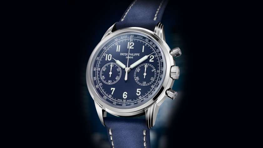 La caja de platino está pulida a mano, con el bisel biselado y las asas en ángulo que son características del modelo réplica de Calatrava, y presenta un sutil diamante empotrado en el costado de la caja a las 6 en punto. La esfera azul presenta una gradación a negro en su periferia exterior y alberga marcadores de hora estilo bastón aplicados y manecillas en oro blanco, con bordes de doble faceta.